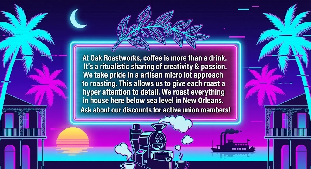 Oak Roastworks is the result of that obsession and drive. Based in Algiers, New Orleans, Our approach to roasting is with the mindset of a technician and the soul of a creative.
