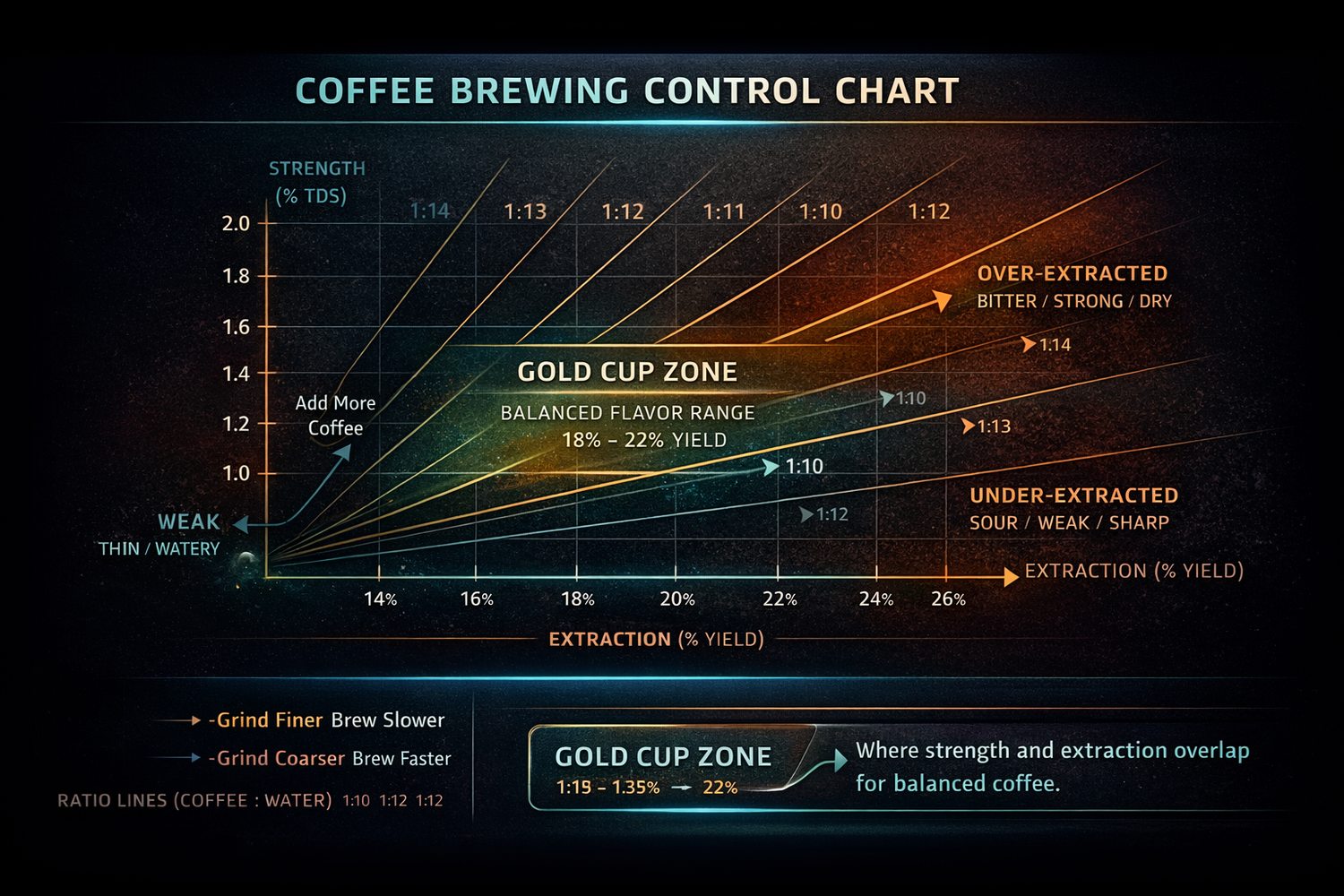 To solve this, coffee professionals began studying how strength and extraction affect flavor perception, using controlled brewing experiments and taste panels.