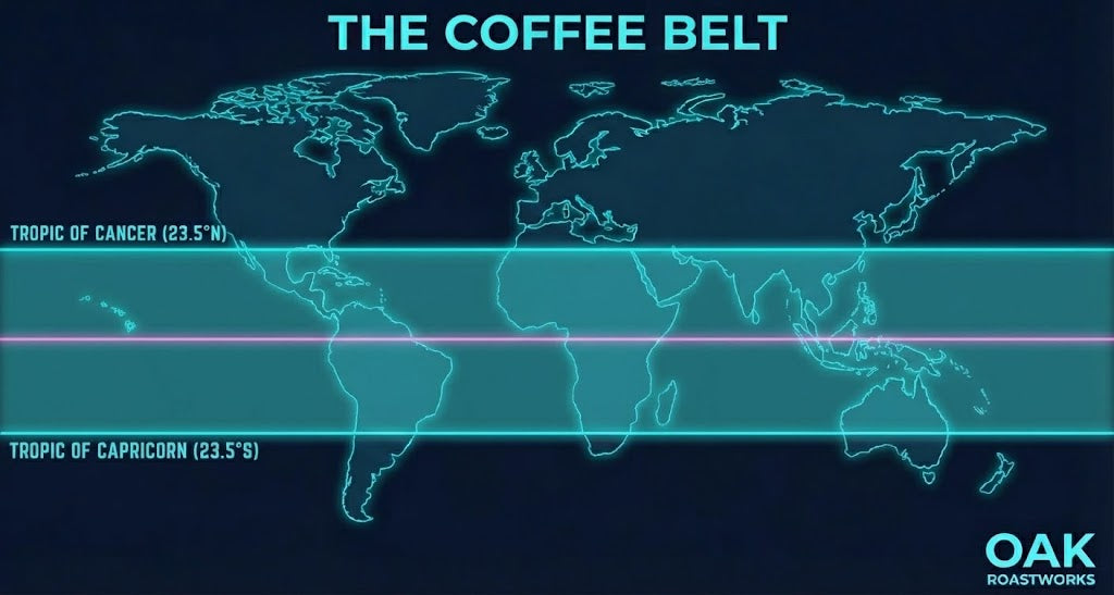 The coffee belt encompasses the world's three primary growing regions in the Americas, Africa, and Asia-Pacific, creating the only environment where the delicate Arabica bean can thrive and develop its complex flavor profiles we strive to pull out in roasting specialty coffee.